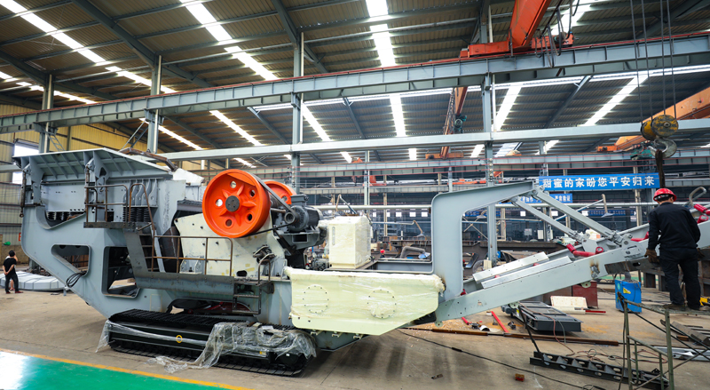 下面这个就是我们公司生产的履带式移动颚破生产车间,下面是履带式破碎站的生产车间,这是一台履带式颚式破碎站,他搭载的是C系鄂式破碎机,这是一款专门用在履带车上的破碎设备,这款破碎站一个小时可以处理一两百吨的原料,像建筑垃圾,矿石,河卵石,青石,页岩,矿渣都可以采用这个破碎站进行破碎,履带式的破碎站有一个很大的好处,就是它采用的是柴油机进行提供动力,所以他不需要外部电力,而且他还可以自由的移动,在短距离移动过程中,它动力强劲,可以从一个现场直接开到另外一个现场,这样的话就省掉了原料运输的问题,原料不需要运输到破碎生产线,而是把破碎生产线直接开到原料的所在地,所以这样就省掉了很多的麻烦,而且破碎生产线也不是固定的,所以他可以随意的移动,这样的话也不用再建设破碎生产线的过程中浪费很多时间。