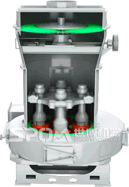 高压悬辊磨主机内,磨辊吊架上紧固有1000-1500公斤压力的高压弹簧。开始工作后,磨辊围绕主轴旋转,并在高压弹簧与离心力的作用下,紧贴磨环滚动,其滚动压力比同等动力条件下的雷蒙粉机高 1.2 倍,故产量大为提高。当被磨物料进入磨腔后,由铲刀铲起送入磨辊与磨环之间进行碾压,碾压后的粉末随鼓风机的循环风带入分析机,合格细粉随气流入旋风集粉器即为成品,大颗粒物粒落回重磨。循环风返回鼓风机再重复以上过程,余风则进入袋式除尘器净化。当磨辊与磨环达到一定磨损后,调整高压弹簧长度,保持磨辊与磨环之间恒定碾压力。从而保证稳定的产量与细度。